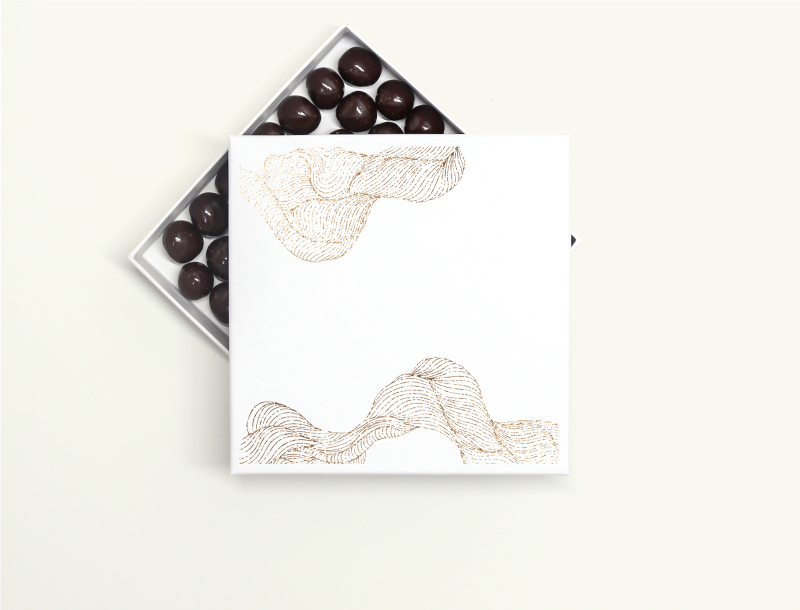 Noisettes lait or et noires, Coeurs céréales nacrés rouge, Chocolat praliné lait, Nougat amande